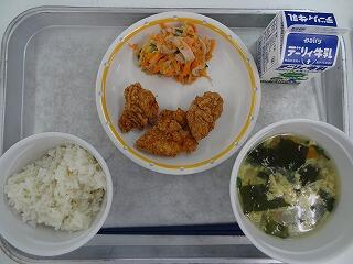 麦ご飯 牛乳 鶏の唐揚げ ツナサラダ 卵とわかめのスープ