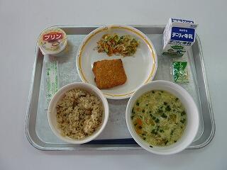 炊き込みご飯 牛乳 白身魚のフライ 酢の物 ニラ玉スープ プリン
