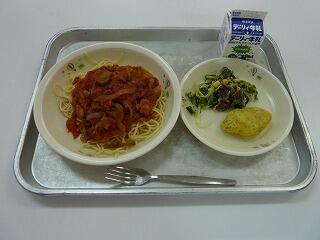 ミートソーススパゲティ 牛乳 ほうれん草オムレツ 海藻サラダ