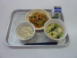 麦ご飯 牛乳 豚と野菜のオイスター炒め 中華スープ