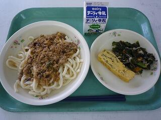 カレーうどん 彩り野菜の卵焼き グリーンサラダ 牛乳