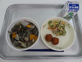 親子丼 牛乳 野菜の梅肉和え けんちん汁