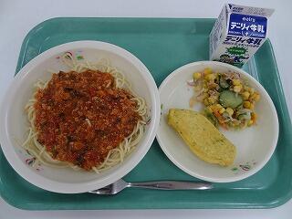 ミートソーススパゲッティ 牛乳 ほうれん草オムレツ コーンサラダ