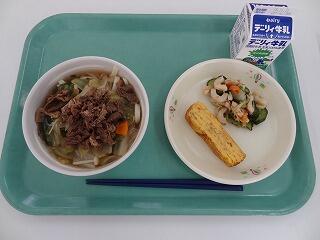 すきやきうどん 牛乳 厚焼き玉子 野菜の梅肉和え