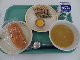 キャロットパン 牛乳 スコッチエッグ ごぼうナッツサラダ かぼちゃとコーンのスープ