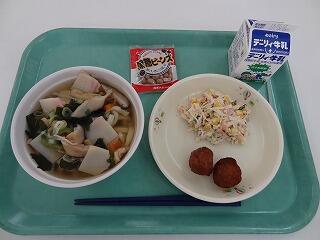 わかめうどん 牛乳 鶏つくね 千切り大根サラダ 黒糖ビーンズ