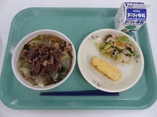 すきやきうどん 牛乳 厚焼きたまご 野菜の梅肉和え