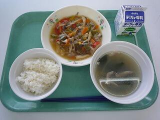 麦ご飯 豚と野菜の黒酢炒め 汁ビーフン 牛乳