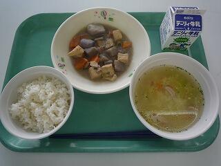 麦ご飯 鶏と里いものみそ煮 ラビオリスープ 牛乳