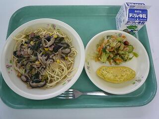 和風きのこスパゲティ オムレツ 豆の和風サラダ 牛乳