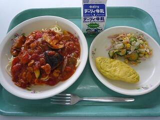 夏野菜スパゲティ ほうれん草オムレツ コーンサラダ 牛乳