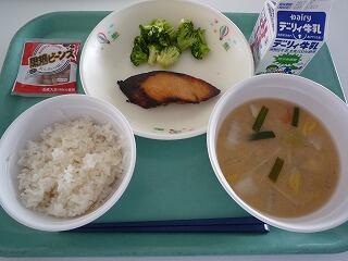 麦ご飯 宮崎カンパチの黒糖がらめ 具だくさんみそ汁 牛乳