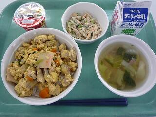親子丼 ごぼうサラダ 五目スープ カップdeヤクルト 牛乳