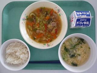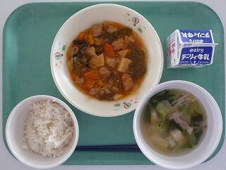 麦ご飯 酢鶏 五目スープ 牛乳