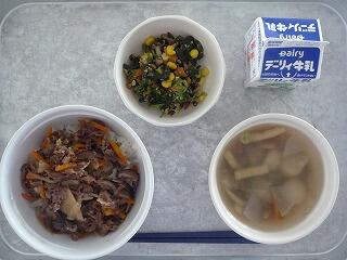 宮崎牛丼 ほうれん草サラダ けんちん汁 牛乳
