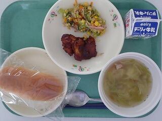 チーズパン 鶏のワイン風味 コーンサラダ 野菜スープ