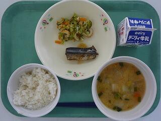 麦ご飯 さんま甘露煮 野菜の梅肉和え キムチ汁 牛乳