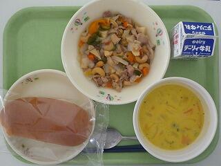 黒糖パン 鶏とナッツの炒め物 パンプキンポタージュ 牛乳
