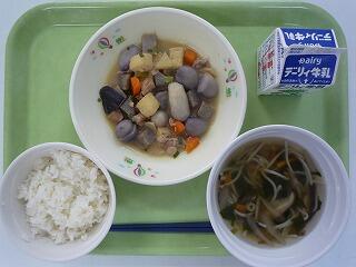 麦ご飯 鶏と里いもの味噌煮 魚そうめん汁 牛乳