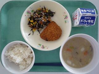 麦ご飯 かぼちゃフライ ひじきサラダ しいたけのみそ汁