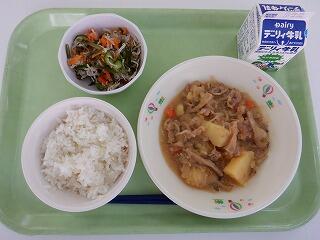 麦ご飯 みそ豚じゃが 茎わかめの酢の物 牛乳