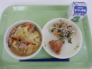 みそラーメン 照り焼きチキン 小松菜のアーモンド和え 牛乳