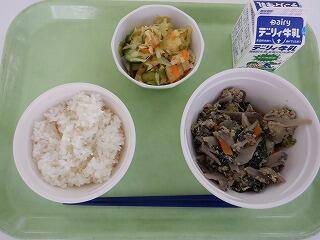 麦ご飯 牛肉の柳川煮 パイナップルサラダ 牛乳