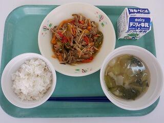 麦ご飯 豚と野菜の黒酢炒め ぎょうざスープ 牛乳