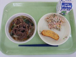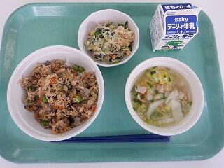 高菜そぼろ丼 野菜の梅肉和え けんちん汁 牛乳