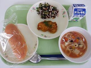麦ご飯 チキン南蛮 添え野菜 にら玉スープ 牛乳
