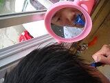| スライドでの説明に聞き入ってる様子[女子] | 鏡を見ながらヒゲを剃っている様子[男子] |