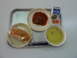 米粉パン 牛乳 トマトハンバーグ 野菜のクリームスープ ミルメーク