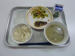 麦ご飯 牛乳 いわしおかか煮 酢の物 鶏きのこ汁