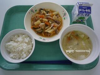 麦ご飯 じゃが豚キムチ 大根と白菜のみそ汁 牛乳