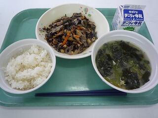 麦ご飯 大豆の磯煮 大根とほうれん草のみそ汁 牛乳