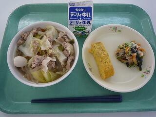 五目うどん 彩り野菜の卵焼き わかめサラダ 牛乳