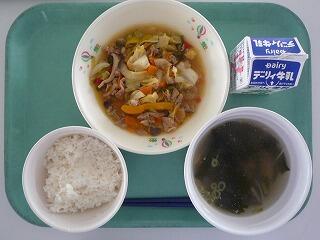 麦ご飯 豚と野菜のオイスター炒め わかめスープ 牛乳