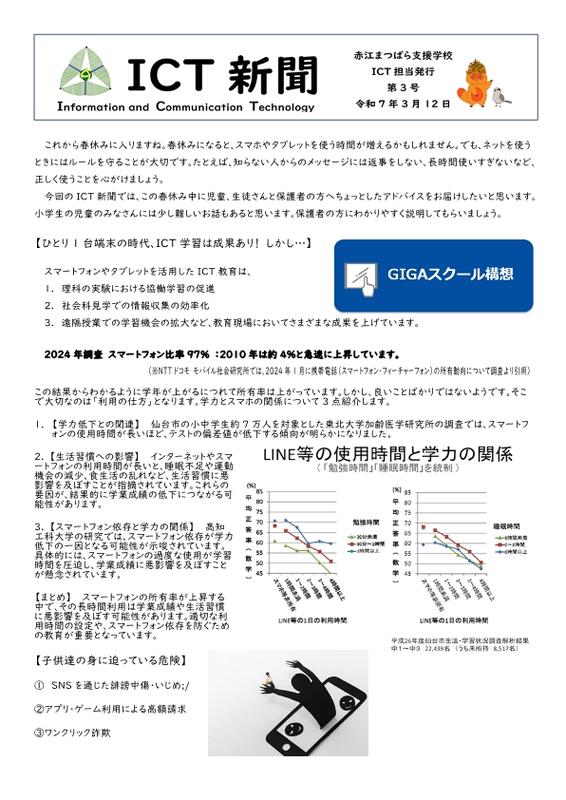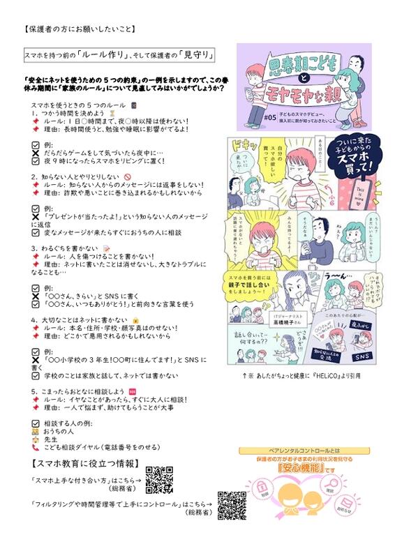 インターネット利用に起因するトラブル未然防止のため、ご家庭での何気ない会話の中で話題にしていただけますとありがたいです。
