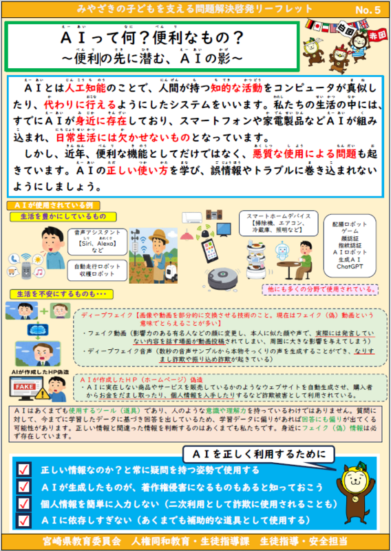 今回は、「AIって何?便利なもの?~便利の先に潜む、AIの影~」と題し、AIの利便性とその裏側に潜むリスクや課題について取り上げています。情報化社会が進む中、AIと適切に付き合い、トラブルに巻き込まれない判断力を育むため、ご家庭でもぜひお子様と話し合うきっかけとしてご活用ください。