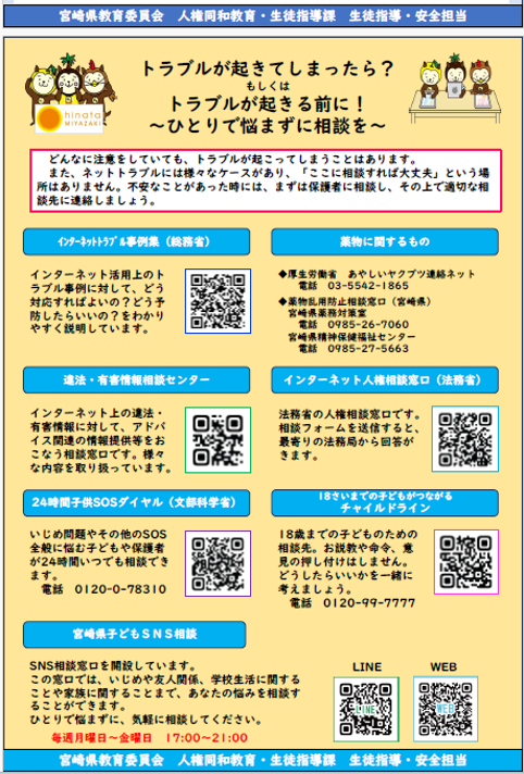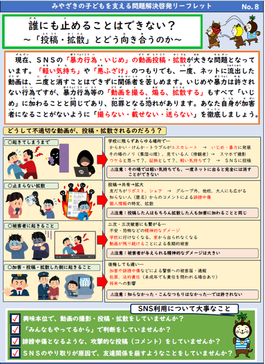 「みやざきの子どもを支える問題解決支援事業」の一環として、啓発リーフレット「誰にも止めることはできない?~「投稿・拡散」とどう向き合うのか~」」が届きましたのでご紹介いたします。