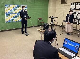 感染症対策として、集会会場からZoom配信を行い、児童生徒は各教室から参加しました。
