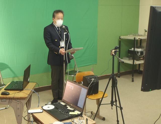 感染症対策として、集会会場からZoom配信を行い、児童生徒は各教室から参加しました。