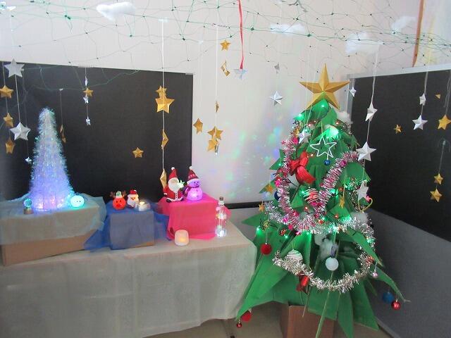 小学部棟の廊下の一角に、子供たちが先生たちに内緒でコツコツと作ったクリスマスコーナーが完成しました!