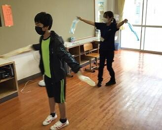 細長い袋をもって、空気で動くスカイダンサーの動きを行いました。