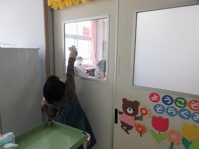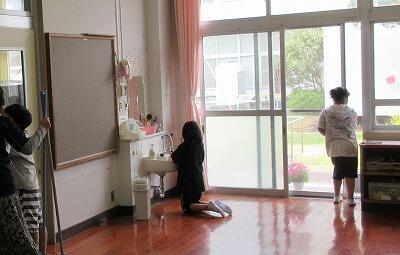 机や椅子を協力して運んだり、箒でささっと掃いたり、背伸びをして窓をゴシゴシ拭いたりしました。