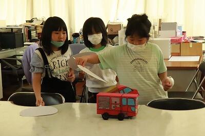 ウォークラリーの最後は、もらったうちわで消防車をあおぎ、火災現場に急行するアトラクションを行い、大盛り上がりでした。