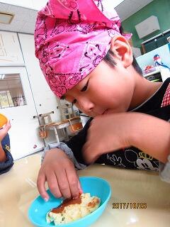 10月は学級でホットケーキづくりをしました。ボールに牛乳を入れたり、ホットケーキミックスの粉を混ぜたりする作業を子どもたちが楽しそうに行っていました。ホットプレートで焼きあがるのを見ながら、「おお!」と声を出して完成を待ちわびる姿が印象的でした。完成したホットケーキは蜂蜜をかけてみんなで食べました。すごく美味しかったようでおかわりの分もぺろりと平らげてしまいました。