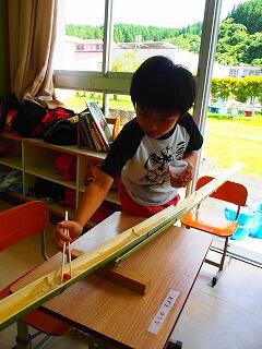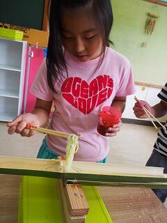 教室の中を通した竹を流れるそうめんに大喜びの子ども達。はしで受け止め、コップのつゆにつけて 「いただきまーす。」  にこにこ笑顔でおいしく食べました。