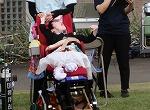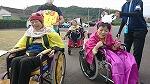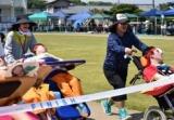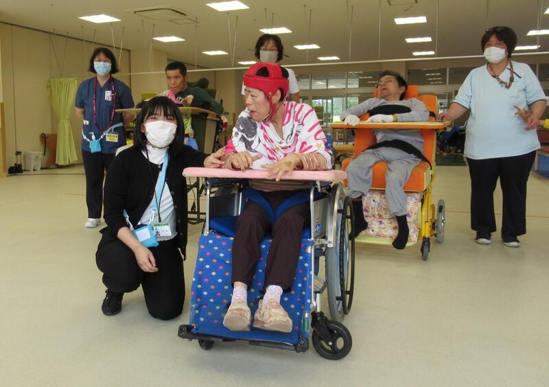5月18日に行われた本校での体育祭では、たくさんの声援の中、職員や病院スタッフと一緒に徒競走で団テント前を駆け抜けました。訪問教育学級としては数年ぶりのスクーリングで、生徒たちも初めての学校で楽しみ半分、緊張半分だったようです。終わった時はホッとしたようで、みんな笑顔で終えることができました。