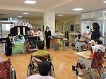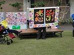 訪問教育学級からは高等部2・3年生が舞台に立ち、本校の日南陽祭で発表した劇「愛泉会高天原物語(あいせんかいたかまがはらものがたり」の中から合奏を行いました。発表の最後には、授業で制作した「あ」「り」「が」「と」「う」の飾り文字を、巻物の留めひもを引っ張ったり、サイコロに貼ったものを転がしたりする形で、一文字ずつ順に皆様にお披露目!大きな拍手をいただき、生徒達はみんな、大満足の表情を浮かべていました。